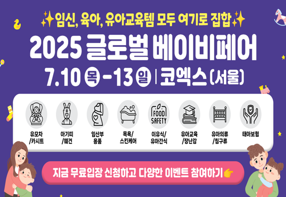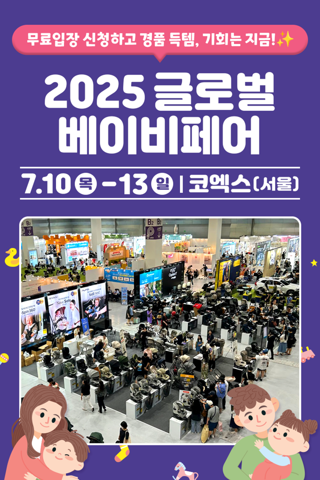 7월 코엑스 글로벌 베이비페어, 지금 무료입장 신청하세요! 7월 10일(목)부터 13일(일)까지! 임신, 출산, 육아, 유아교육의 모든 것! 맘앤대디의 필수 코스, 2025 코엑스 글로벌 베이비페어에서 만나